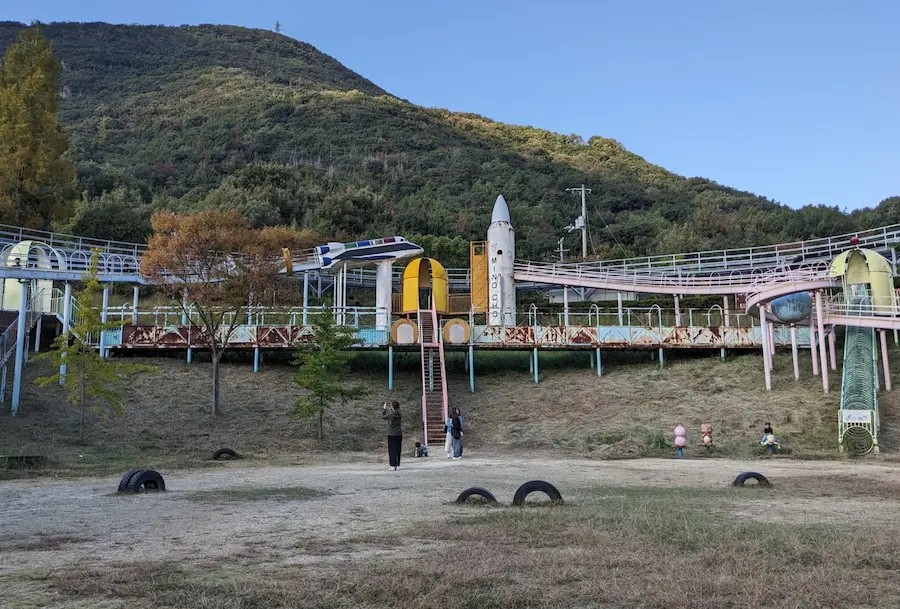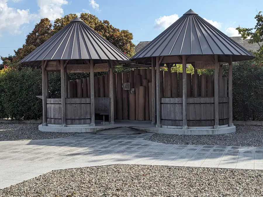 - Zona de descanso techada en antiguo parque. El espacio solía estar regenteado por un onsen que ahora está cerrado. Baños, agua corriente.