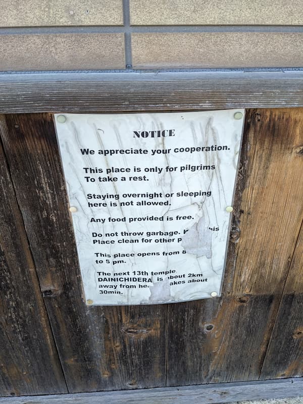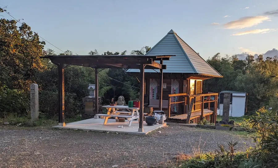 Henro Goya 遍路小屋・へんろ小屋 — Henro huts. Espacios de descanso para peregrinos que asemejan a micro cabañas abiertas. Hay al menos unas 50 construidas y dispersas por toda la isla. Suelen ser construidas y mantenidas por las comunidades locales. En algunas está permitido pernoctar, en otras no, y las hay que no aclaran. Muchas veces los carteles están en japonés. Usa el traductor de google para saber si es correcto dormir allí.