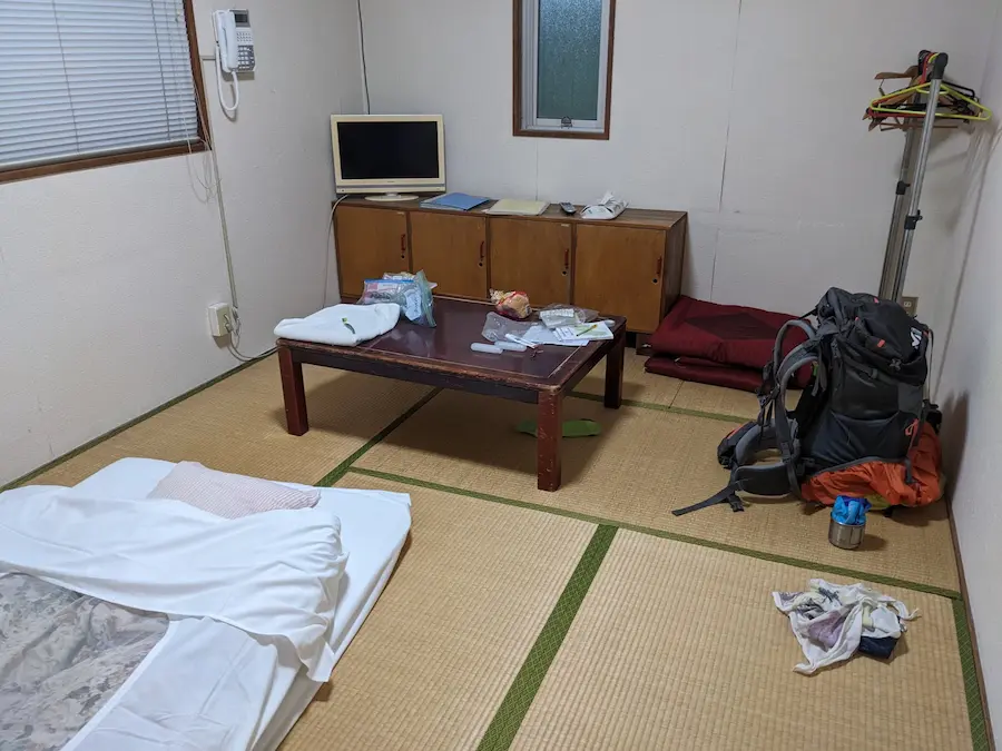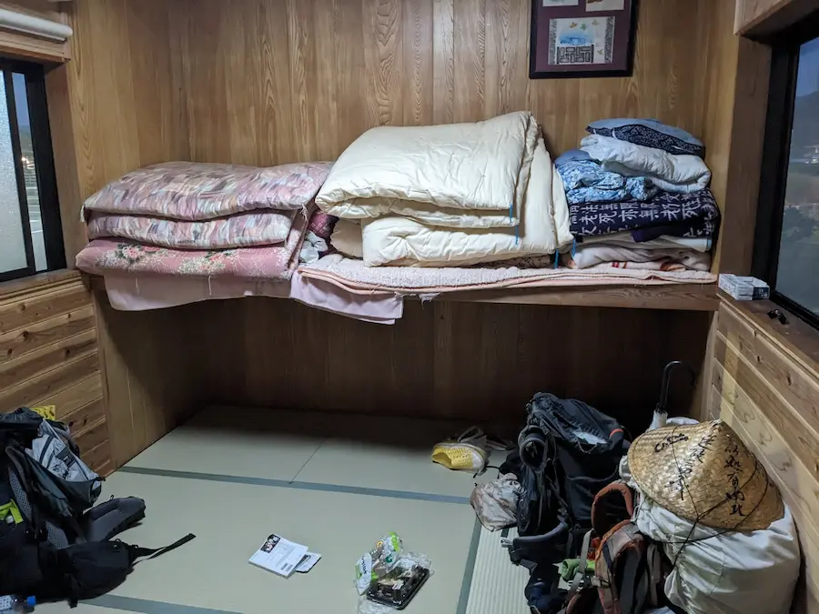 Tsūyadō 通夜堂 — Alojamiento gratuito para peregrinos proveído por los templos. El tsuyado suele estar ubicado dentro de los terrenos del propio templo (aunque no siempre) y puede ser tanto un espacio cerrado como una cabaña abierta (hut). La norma es que llegues antes de las 5 p.m. (horario de cierre) para solicitar permiso en la oficina del templo. Muchos no permiten mujeres y hombres juntos y esto puede ser un problema si hay solo una habitación. Dicho esto, mi experiencia fue la contraria. Estuve en dos tsuyados distintos al mismo tiempo que uno o dos hombres y los monjes no me hicieron inconvenientes.